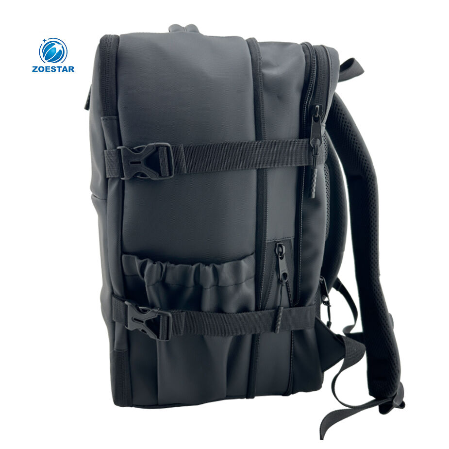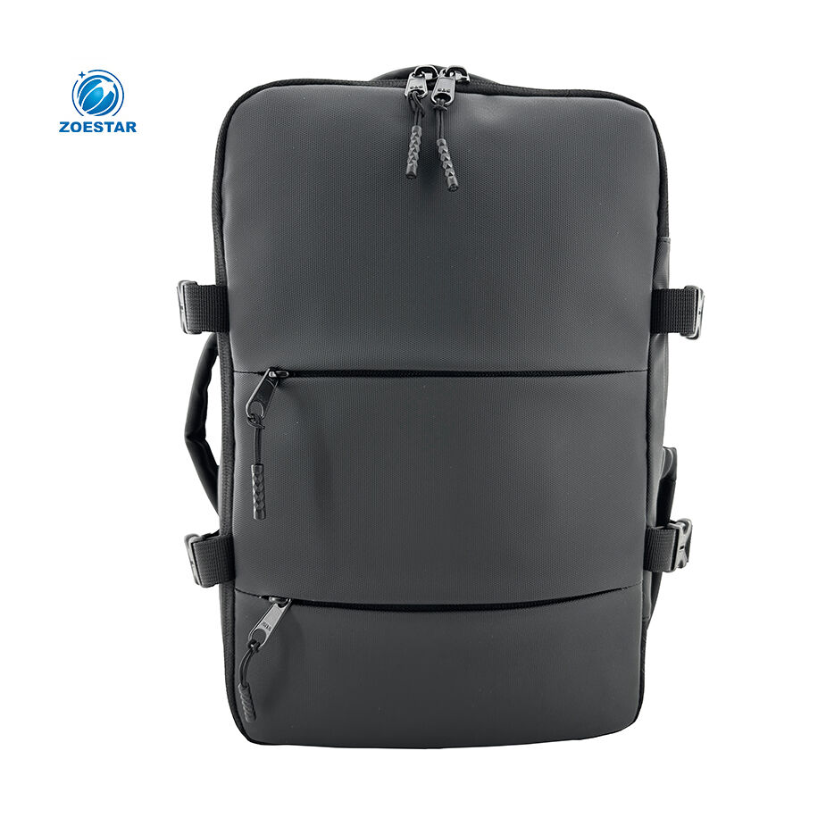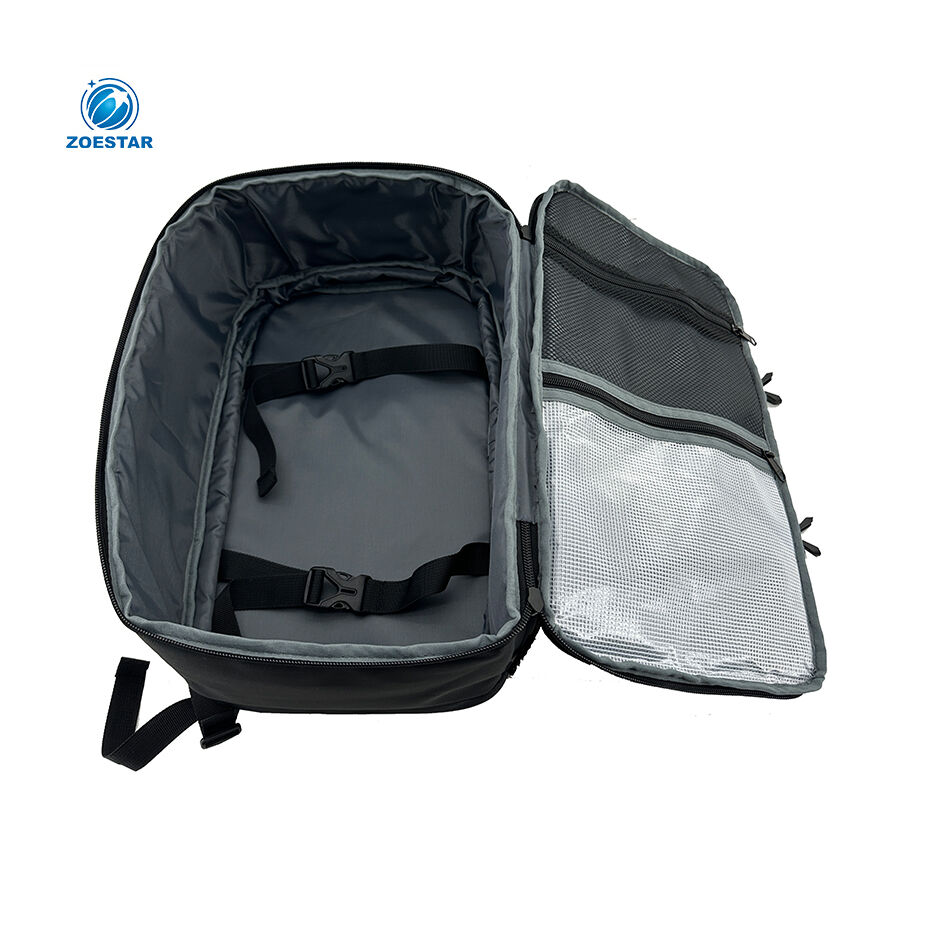 The backpack features a three-side zip opening, similar to a trolley suitcase, allowing easy access and flat packing. Inside, packing straps help secure clothing, while the lid includes a transparent PVC mesh zip pocket and an additional zippered mesh pocket for quick organization.