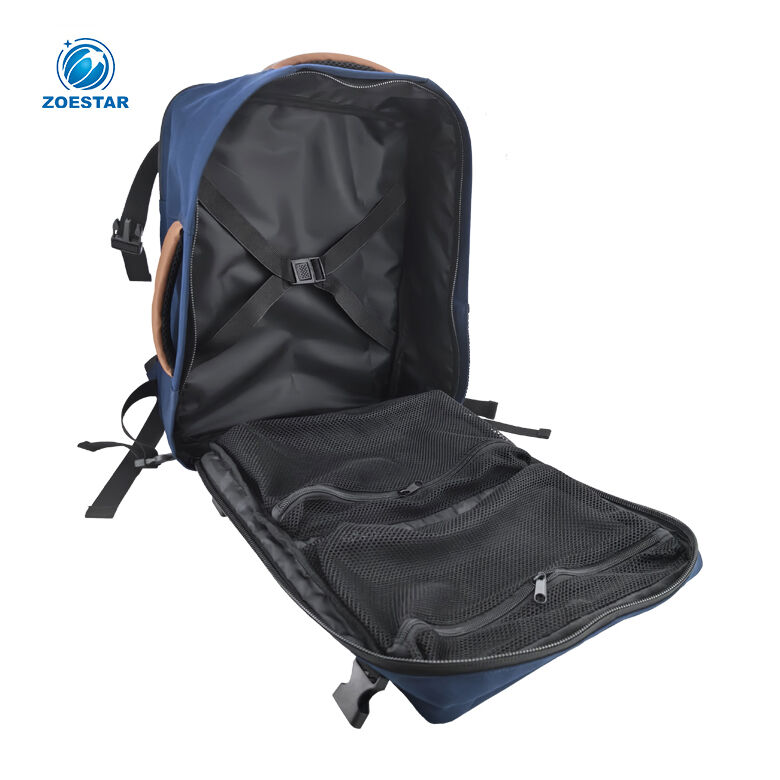 The main compartment features a wide zip opening, similar to a trolley suitcase, allowing easy packing and access. Inside, packing straps help secure clothing, while the lid includes two evenly divided zippered mesh pockets for organized storage.